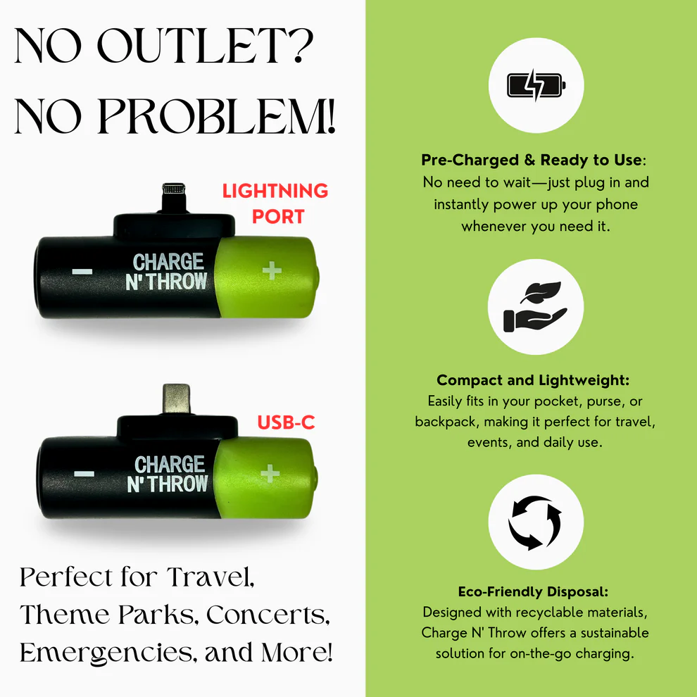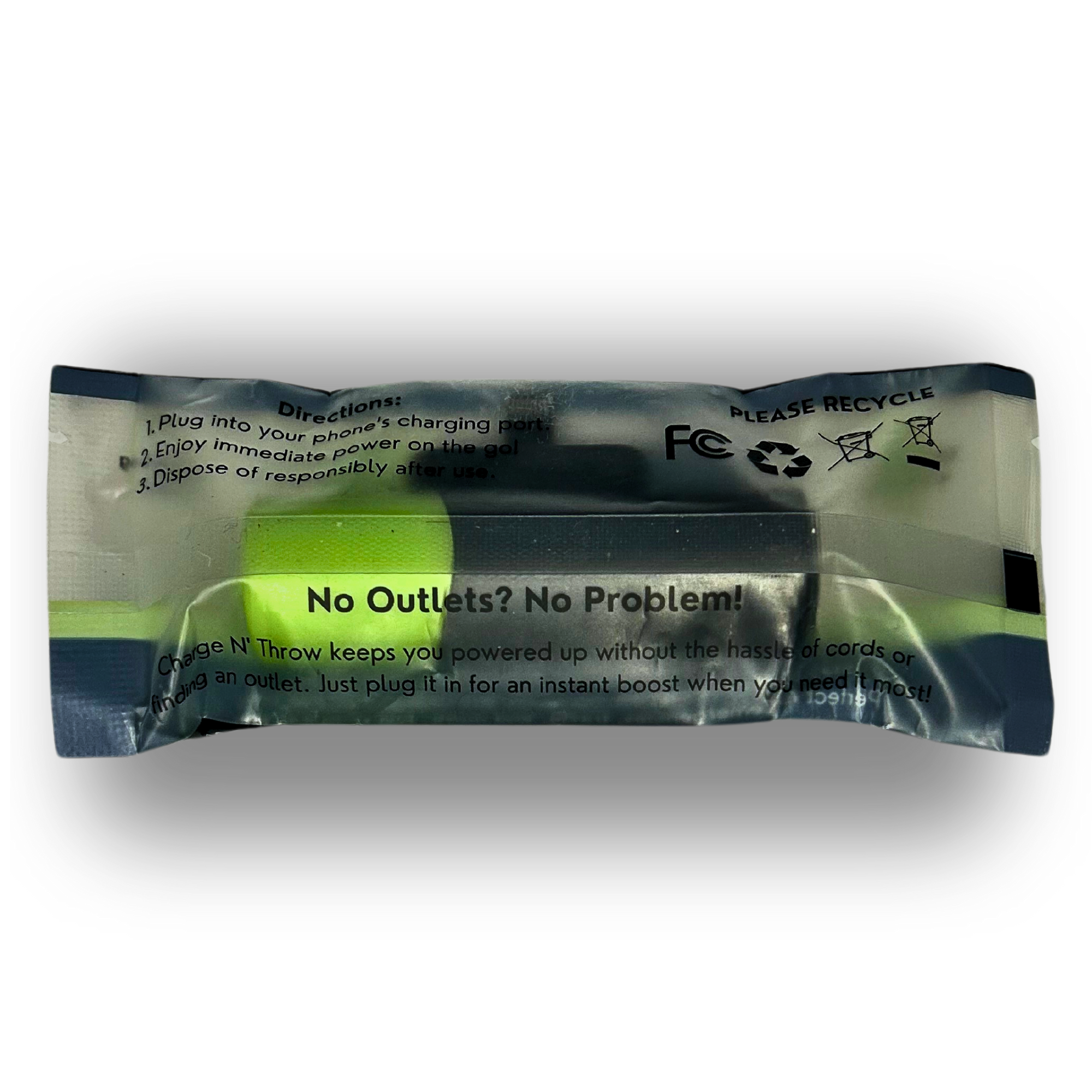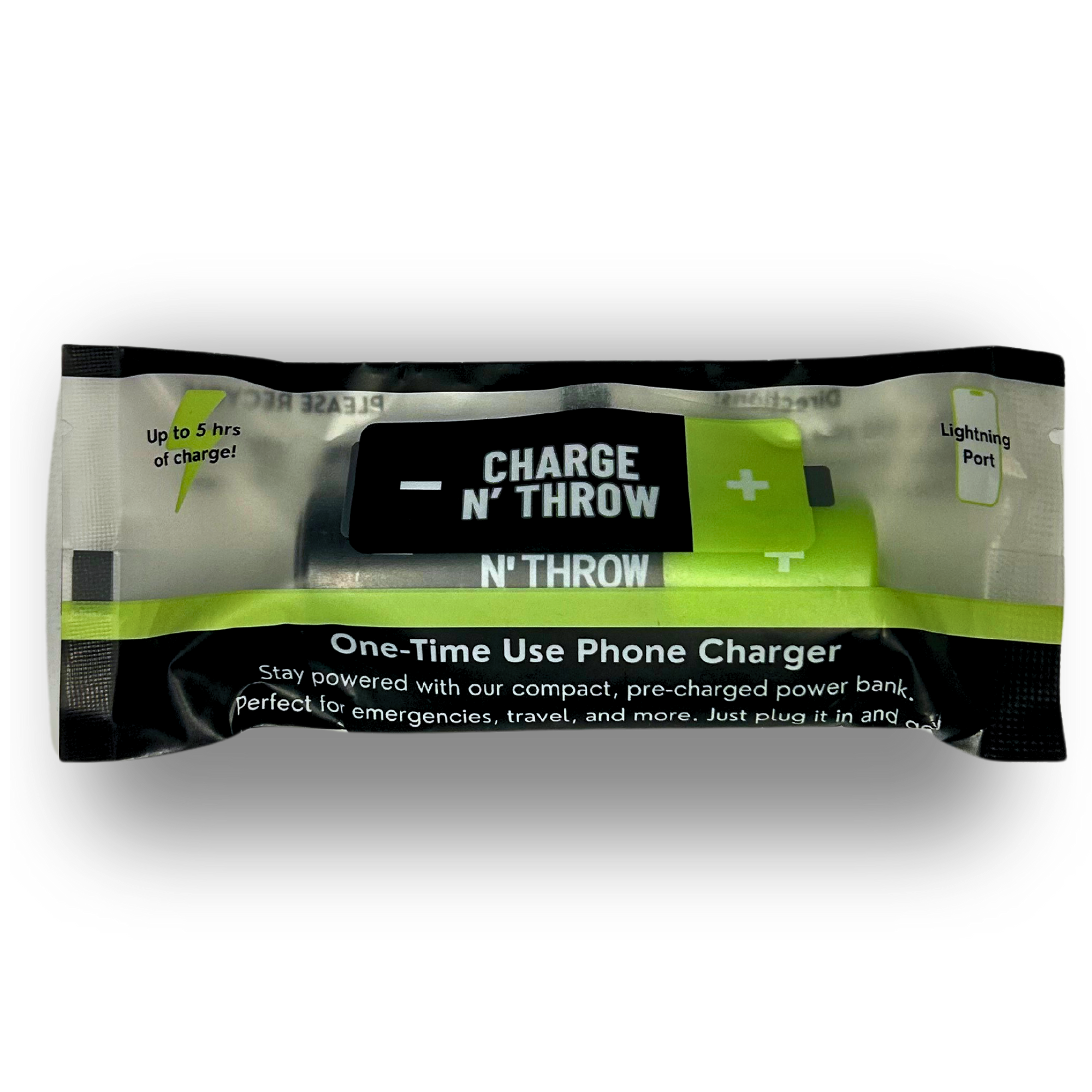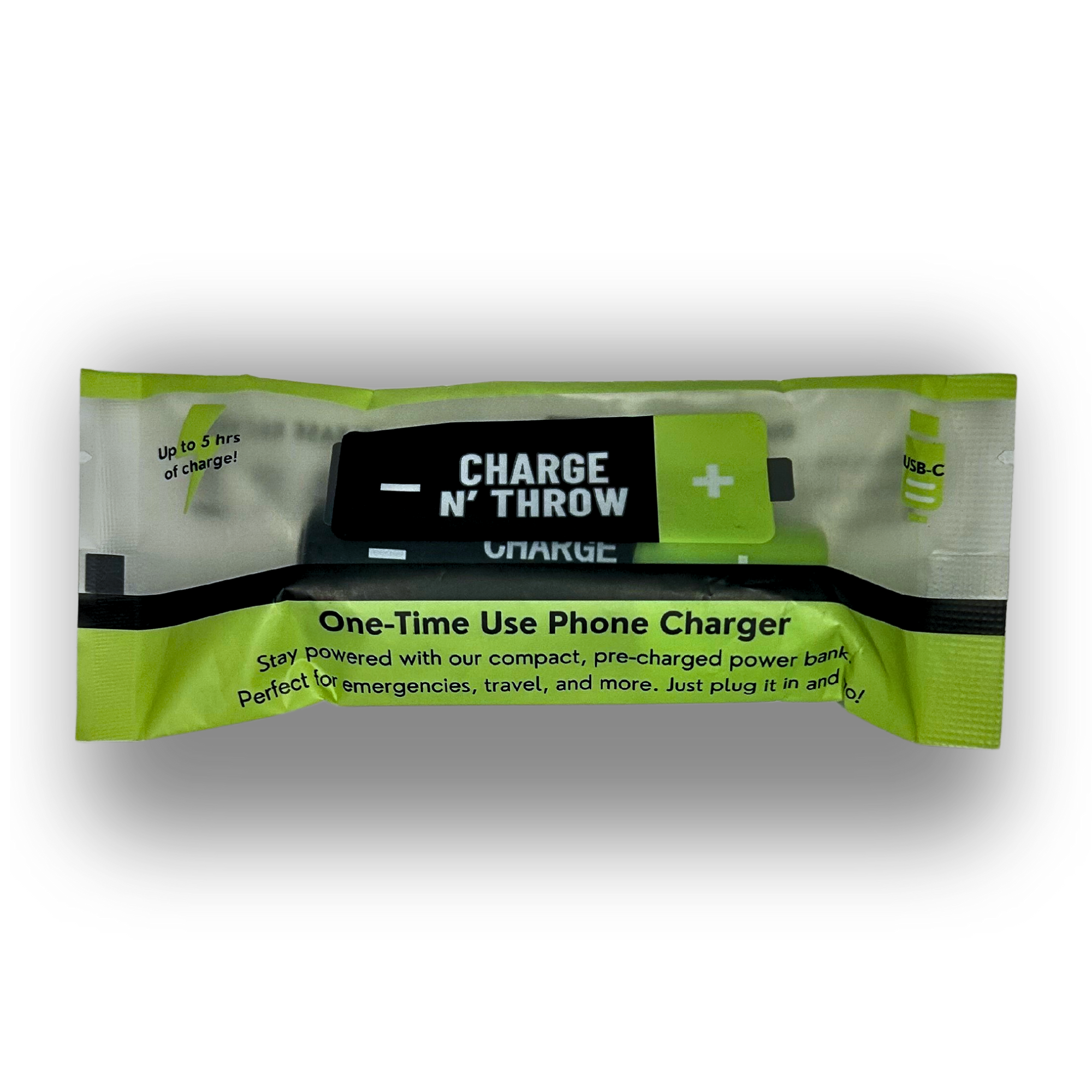 Never let a low battery slow you down! The Charge N’ Throw One-Time Use Phone Charger is your on-the-go power solution. Pre-charged and ready to use, this compact and lightweight charger delivers up to 5 hours of power—ideal for travel, emergencies, or busy days when you need a quick boost.